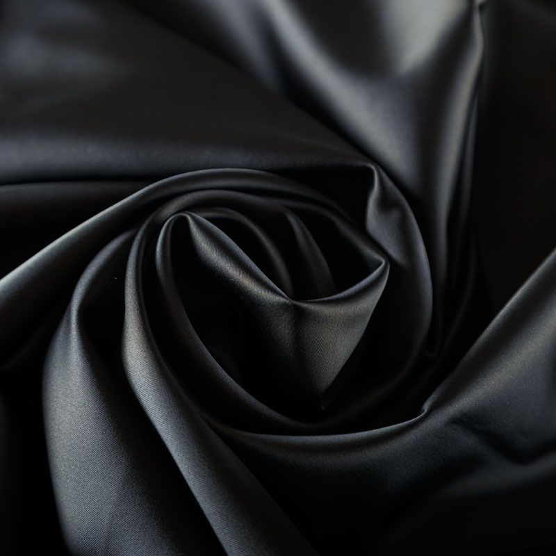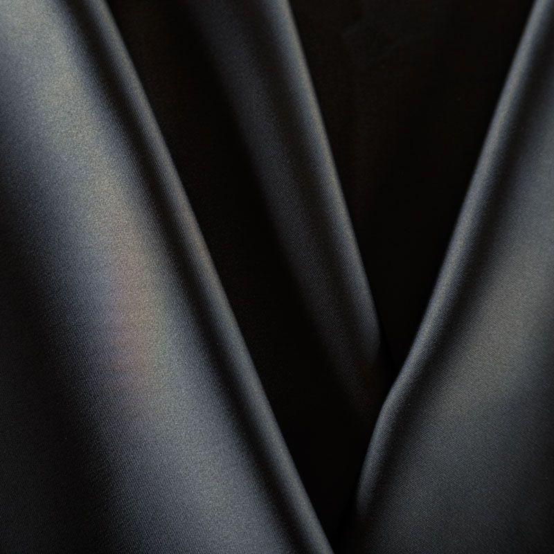 Итальянский костюмно-плательный атлас ватуссо черного оттенка. Ткань плотная, но пластичная, хорошо держит форму и отлично тянется, собирается в красивые складки и драпировки. Почти не мнется, очень удобный и практичный. Блеск умеренный, смотрится дорого, благородно. Подойдет для пошива прямых силуэтов-футляров, приталенных платьев с пышной юбкой и крупными драпировками, изделий с заложенными складками, нарядных изделий, вечерних костюмов, летнего пальто, юбки, для изготовления корсетов.