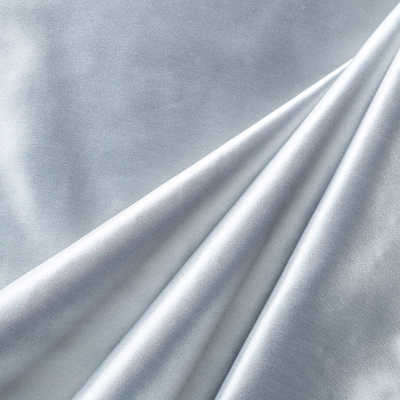 Итальянский костюмно-плательный атлас ватуссо серебристо-серого оттенка. Ткань плотная, но пластичная, хорошо держит форму и отлично тянется, собирается в красивые складки и драпировки. Почти не мнется, очень удобный и практичный. Блеск умеренный, смотрится дорого, благородно. Подойдет для пошива прямых силуэтов-футляров, приталенных платьев с пышной юбкой и крупными драпировками, изделий с заложенными складками, нарядных изделий, вечерних костюмов, летнего пальто, юбки, для изготовления корсетов.