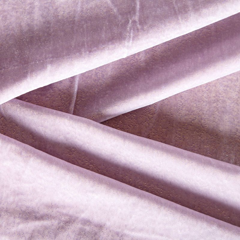 Итальянский шелковый бархат светло-лилового цвета с золотистым едва заметным напылением. Ткань легкая, пластичная, мягкая, с коротким и блестящим ворсом, имеющим направление, очень приятная на ощупь, прекрасно драпируется. Подойдет для платья, юбки, туники, блузки, комбинезона, свободных брюк и костюма свободного кроя.