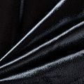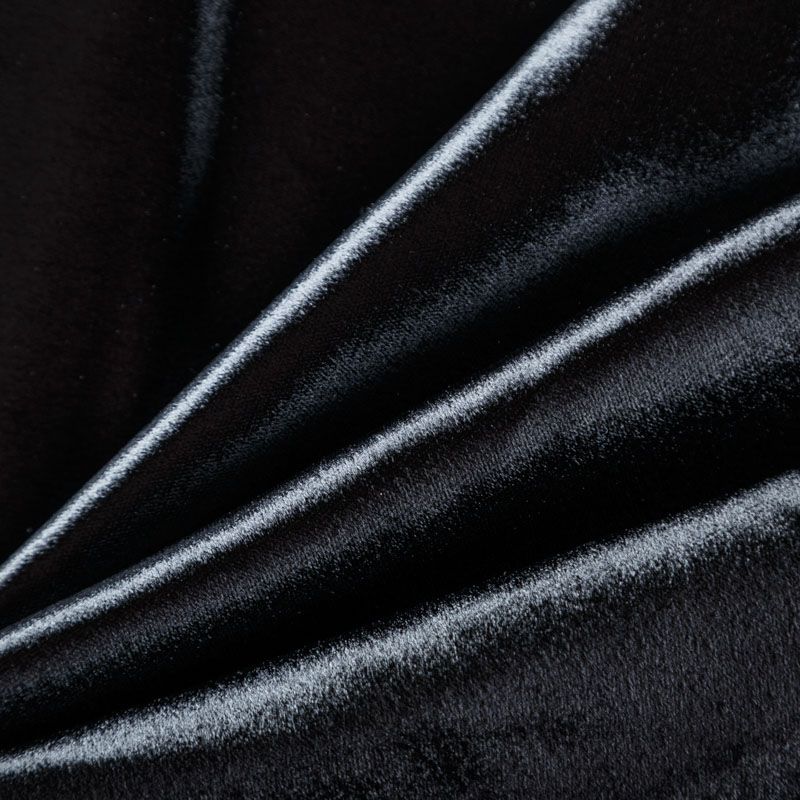 Хлопковый вискозный бархат черного оттенка. Ткань плотная, мягкая с коротким направленным ворсом. Пластичная, хорошо драпируется, струится. Имеет благородный глянцевый блеск. Подойдет для пошива костюма в пижамном стиле, жакета, юбки, жилета, шорт, комбинезонов, брюк, платья.