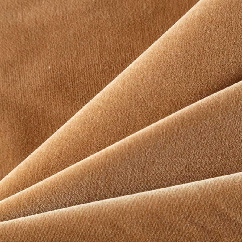 Хлопковый итальянский бархат карамельного оттенка. Ткань плотная, мягкая с коротким ворсом. Не грубая, хорошо драпируется. Имеет благородный матовый оттенок. Подойдет для пошива нарядного костюма, жакета, юбки, жилета, шорт, комбинезонов, брюк, платья-футляр, легкого пальто или бомбера.