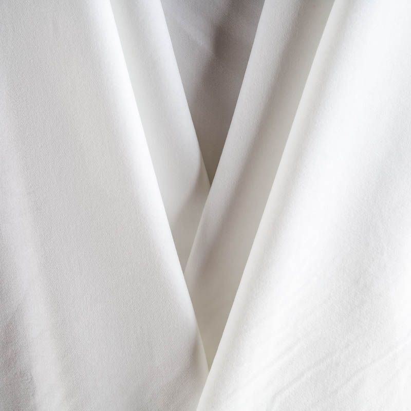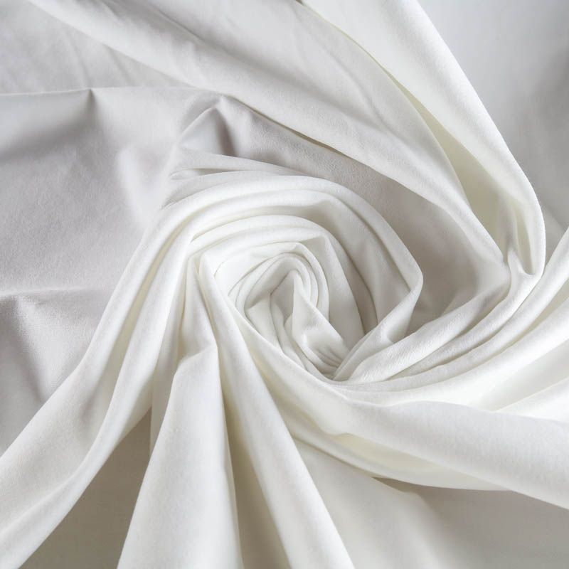 Плотный итальянский бархат из хлопка белого цвета с добавлением небольшого количества эластана. Ткань очень приятная на ощупь, пластичная, поверхность матовая, немного тянется, держит форму, прочная, износостойкая.  Идеально подойдет для нарядного костюма, жакета, юбки, жилета, комбинезона, брюк, платья-футляра.