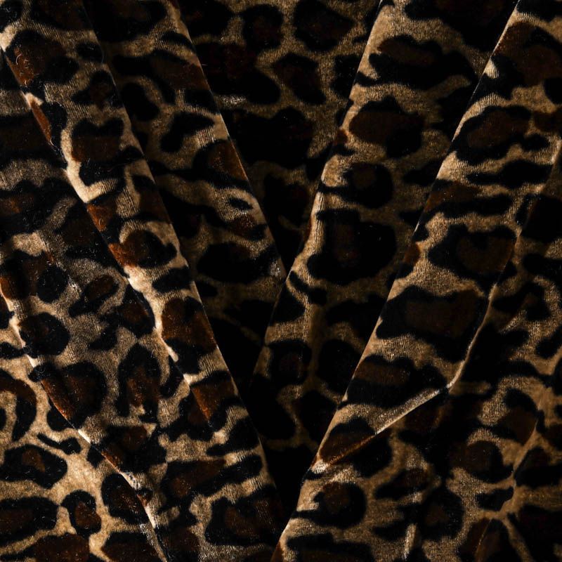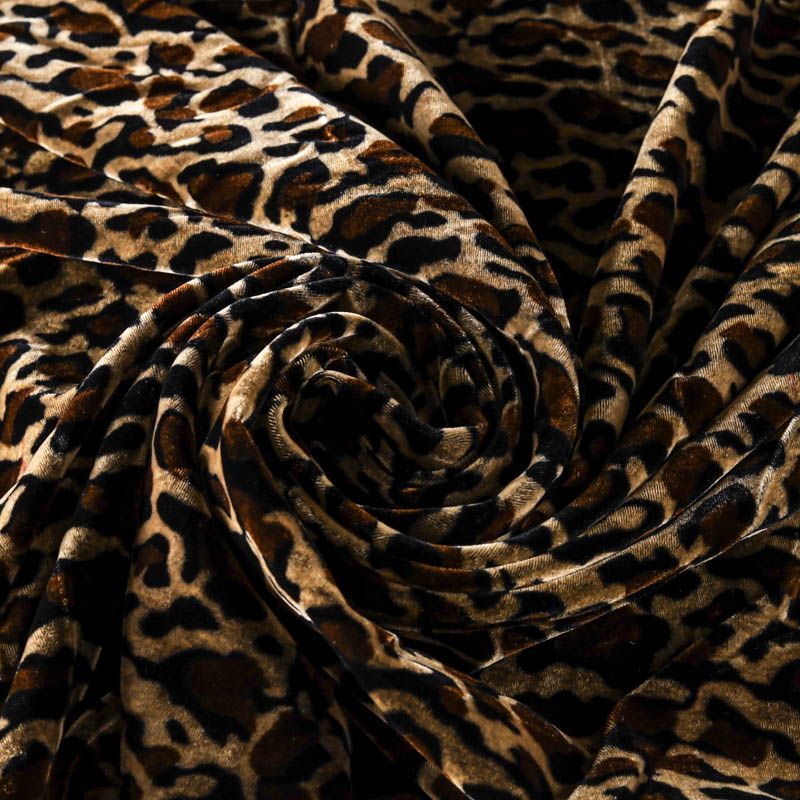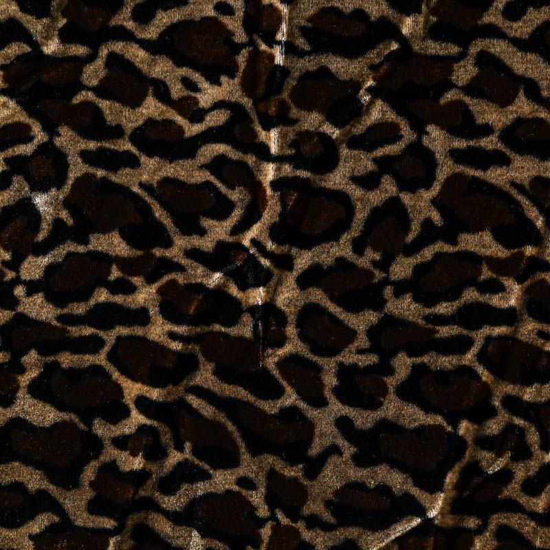 Итальянский бархат с анималистической расцветкой в естественных оттенках. Ткань легкая, пластичная, мягкая, с коротким и блестящим ворсом, имеющим направление, очень приятная на ощупь, прекрасно драпируется. Подойдет для платья, юбки, туники, блузки, комбинезона, свободных брюк и костюма свободного кроя.