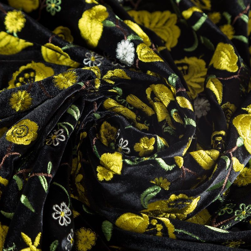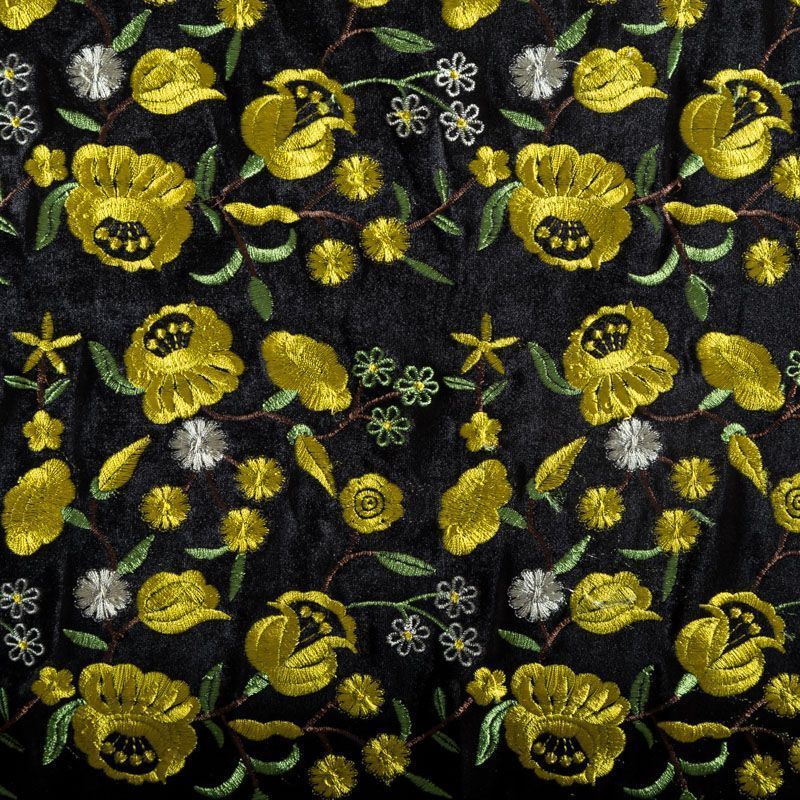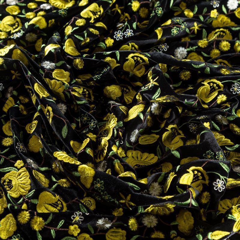 Итальянский бархат черного цвета, декорирован вышивкой фантазийными цветами в желтых оттенках, расположенной по всему полотну.  Ткань приятная на ощупь, хорошо драпируется и держит форму, обладает благородным блеском, тянется за счет эластана в составе. Прекрасно подойдет для жакета, юбки, костюма, жилета, платья.