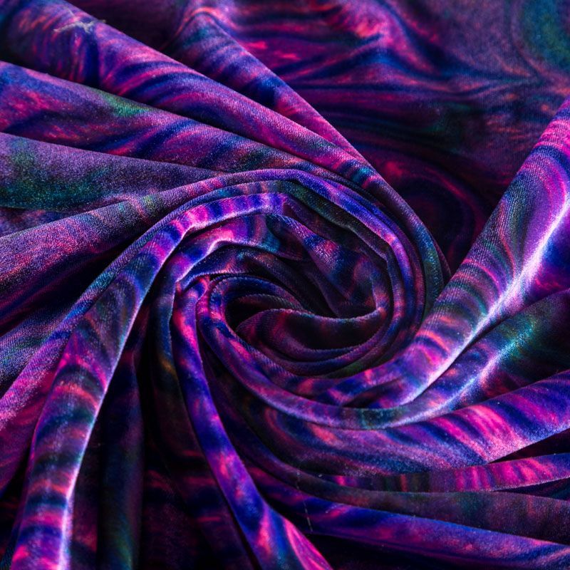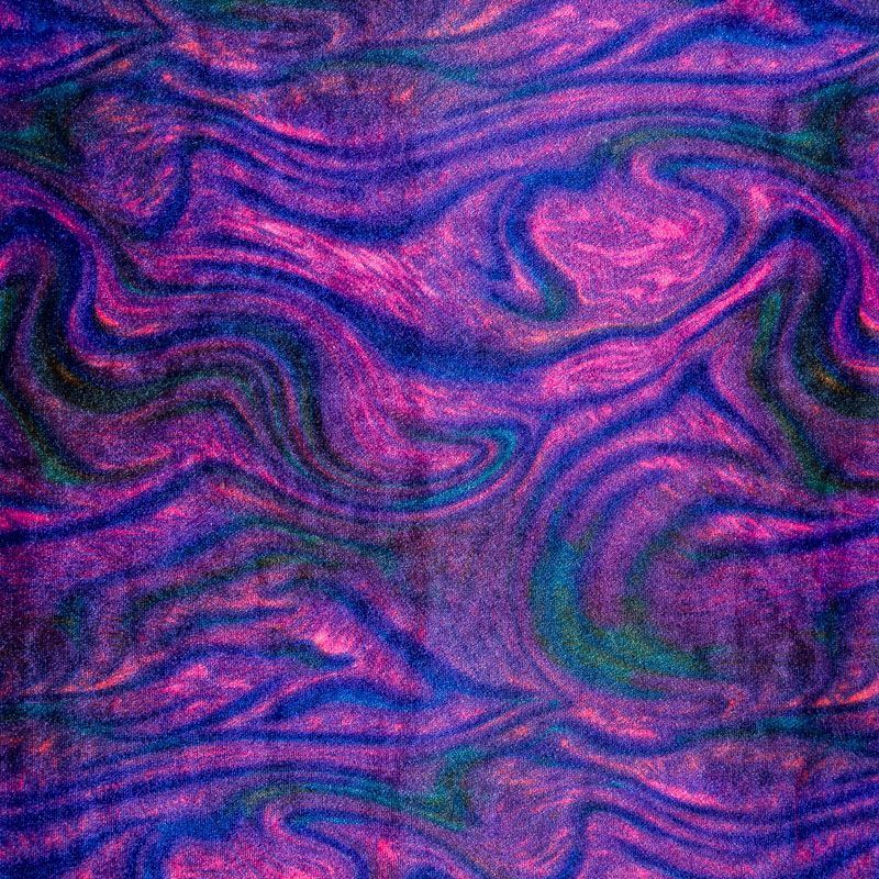 Пластичный, мягкий бархат с абстрактным дизайном в фиолетово-розовых оттенках. Ткань очень приятна на ощупь, не мнется, хорошо тянется за счет эластана в составе и драпируется. Цвет играет отблесками и полутонами. Бархат идеально подходит для пошива вечерних платьев, юбок, костюмов, а также стильных аксессуаров.
