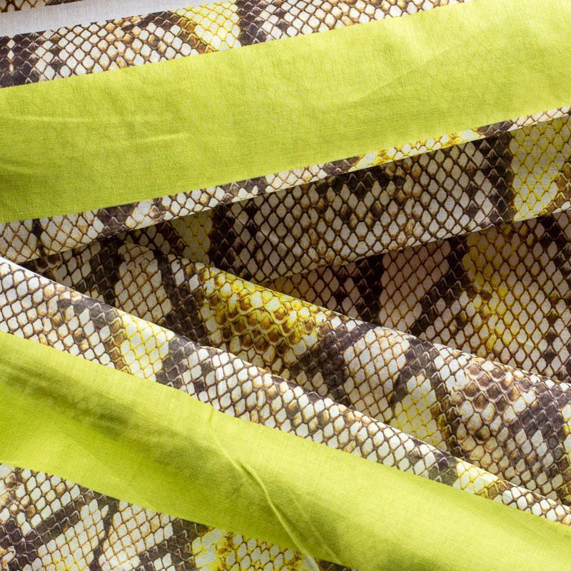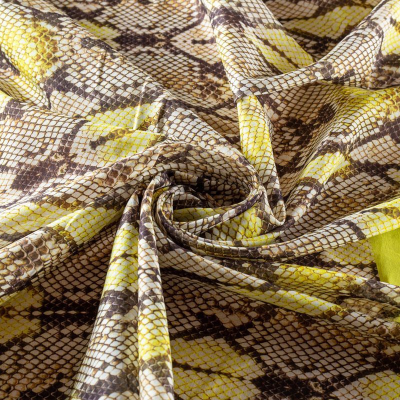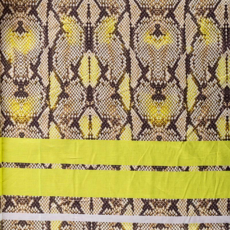Итальянский хлопковый батист-купон с анималичтическим модным принтом в бежево-коричневых тонах. По краям купона, направленного по длине рулона, расположены по две полоски желтого оттенка.  Ткань очень легкая, прозрачная, приятная на ощупь, нежная, пластичная, хорошо и мягко драпируется, летящая. Батист подойдёт для модных блуз с объёмными рукавами, летних платьев и сарафанов с длинной летящей юбкой, прозрачных рубашек, декорированных объёмными бантами, туник и топов.