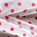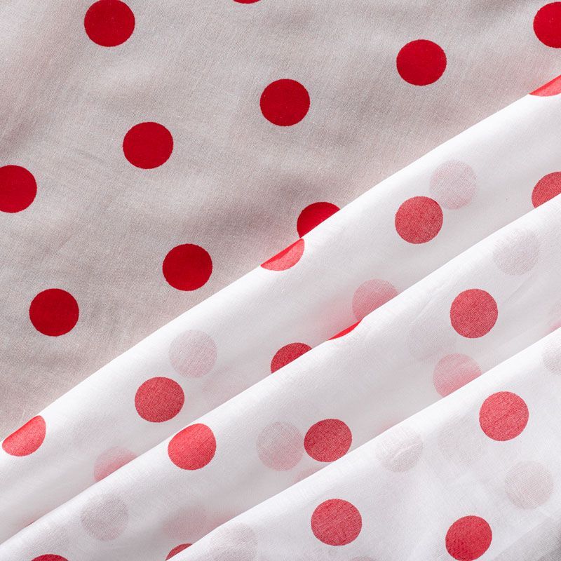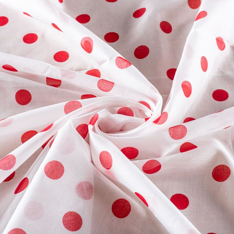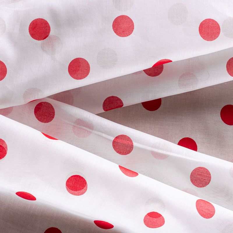 Итальянский хлопковый батист с классическим принтом "в горох" красного цвета. Ткань очень легкая, прозрачная, приятная на ощупь, нежная, пластичная, хорошо и мягко драпируется, летящая. Батист подойдёт для модных блуз с объёмными рукавами, летних платьев и сарафанов с длинной летящей юбкой, прозрачных рубашек, декорированных объёмными бантами, туник и топов.