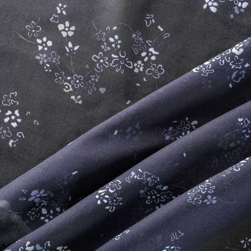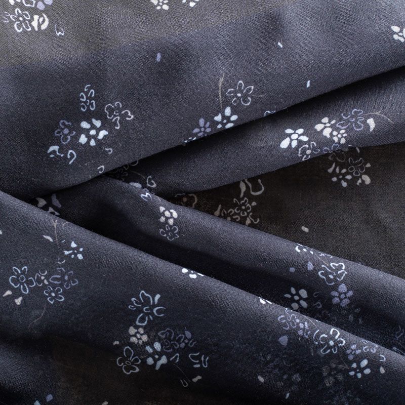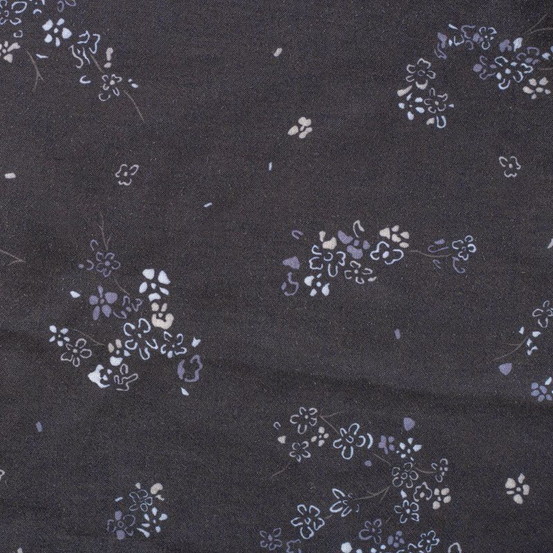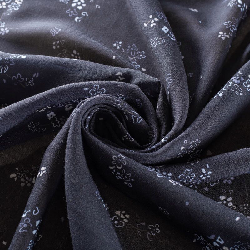 Батист с мелким цветочным принтом в молочно-серых оттенках на черном фоне. Ткань очень легкая, прозрачная, приятная на ощупь, нежная, пластичная, хорошо и мягко драпируется, летящая. Батист подойдёт для модных блуз с объёмными рукавами, летних платьев и сарафанов с длинной летящей юбкой, прозрачных рубашек, декорированных объёмными бантами, туник и топов.
