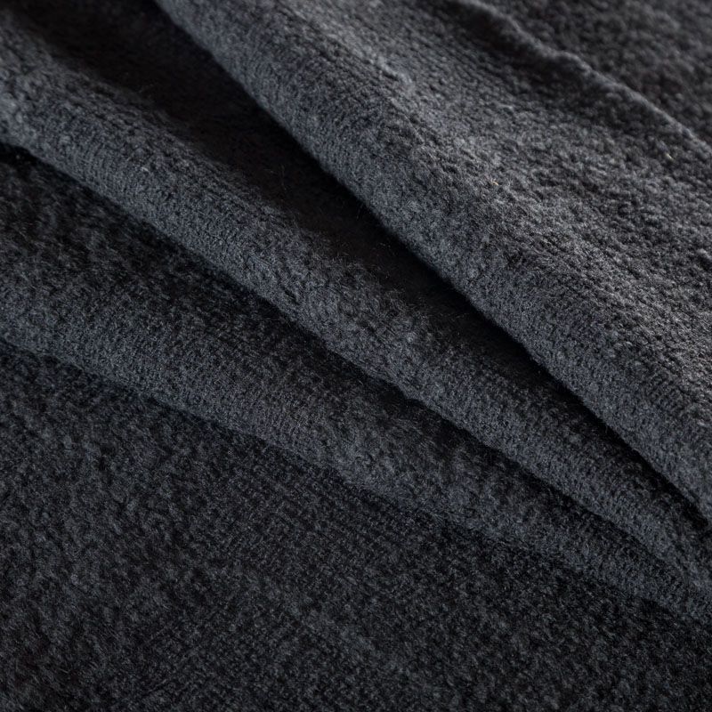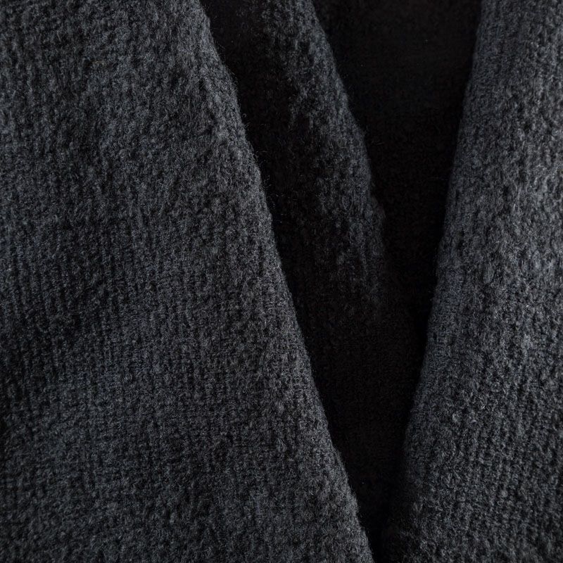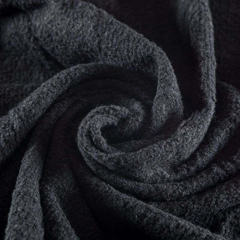 Плотная, объемная и фактурная ткань из шерсти с добавлением хлопка черного оттенка с жаккардовым геометрическим узором. Полотно не тяжелое, не сминается и износоустойчивое, не деформируется и не растягивается. Букле будет уместно для пошива пальто, кардигана, бомбера, куртки-рубашки, теплого костюма.