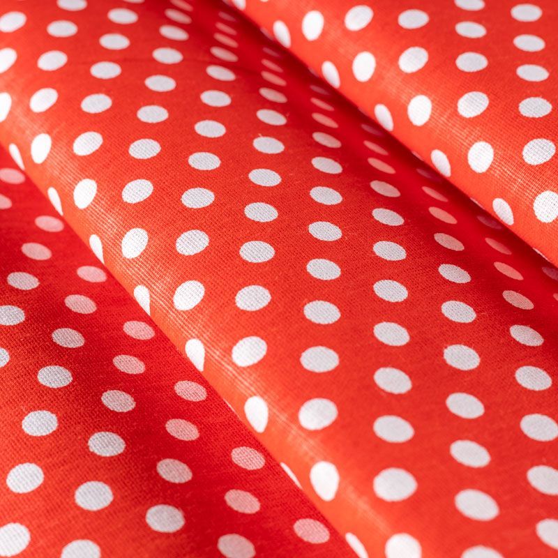 Плотная натуральная ткань с особым принципом переплетения нитей: крест-накрест. Имеет гладкую матовую поверхность чуть шероховатую на ощупь, не тянется, немного просвечивает. Прочная и стойкая к износу, надолго сохраняет яркость красок, не растягивается при стирке, практически не мнется. Мелкий белый горошек (5 мм) на насыщенном красном фоне прекрасно подойдет для пошива постельного белья, изготовления пеленок, бортиков для кроватки, домашней одежды и других предметов интерьера.
