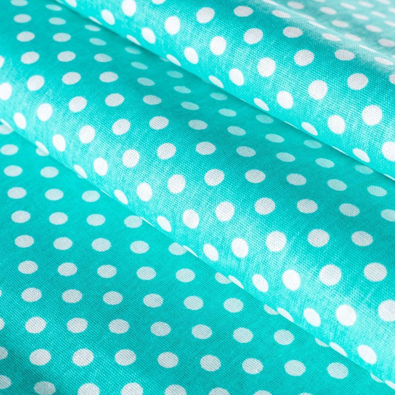 Плотная натуральная ткань с особым принципом переплетения нитей: крест-накрест. Имеет гладкую матовую поверхность чуть шероховатую на ощупь, не тянется, немного просвечивает. Прочная и стойкая к износу, надолго сохраняет яркость красок, не растягивается при стирке, практически не мнется. Мелкий белый горошек (5 мм) на ярком бирюзовом фоне прекрасно подойдет для пошива постельного белья, изготовления пеленок, бортиков для кроватки, домашней одежды и других предметов интерьера.