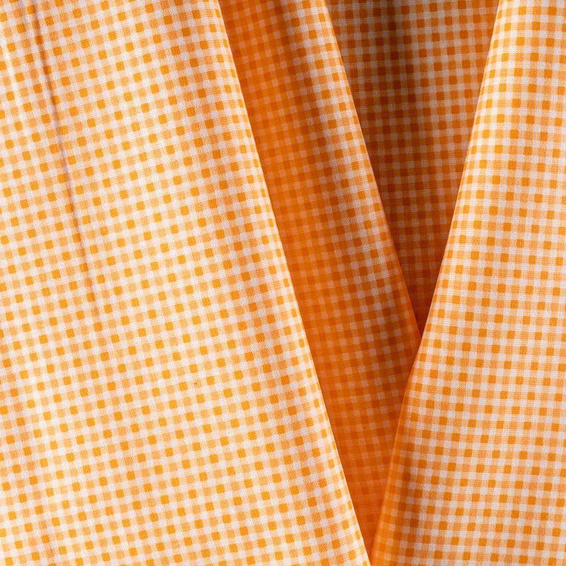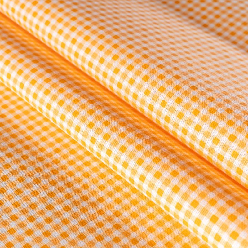 Плотная натуральная ткань с особым принципом переплетения нитей: крест-накрест. Имеет гладкую матовую поверхность чуть шероховатую на ощупь, не тянется, немного просвечивает. Прочная и стойкая к износу, надолго сохраняет яркость красок, не растягивается при стирке, практически не мнется. Рисунок в мелкую клеточку на фоне цвета спелого апельсина прекрасно подойдет для пошива постельного белья, изготовления пеленок, бортиков для кроватки, домашней одежды и других предметов интерьера.
