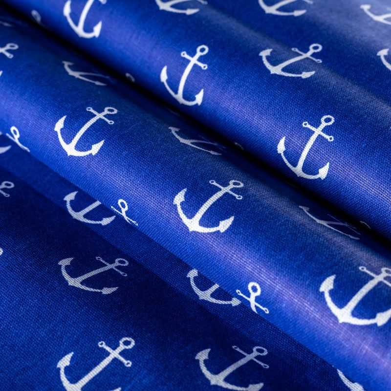 Плотная натуральная ткань с особым принципом переплетения нитей: крест-накрест. Имеет гладкую матовую поверхность, немного шероховатая на ощупь, не тянется, немного просвечивает. Прочная и стойкая к износу, надолго сохраняет яркость красок, практически не мнется. Морской летний принт в виде белых якорей на насыщенном фиолетово-синем фоне прекрасно подойдет для пошива постельного белья, изготовления пеленок, бортиков для кроватки, домашней одежды и других предметов интерьера.