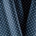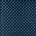 Плотная натуральная ткань с особым принципом переплетения нитей: крест-накрест. Имеет гладкую матовую поверхность чуть шероховатую на ощупь, не тянется, немного просвечивает. Прочная и стойкая к износу, надолго сохраняет яркость красок, не растягивается при стирке, практически не мнется. Принт в виде мелких белых звездочек на темно-синем фоне прекрасно подойдет для пошива постельного белья, изготовления пеленок, бортиков для кроватки, домашней одежды и других предметов интерьера.