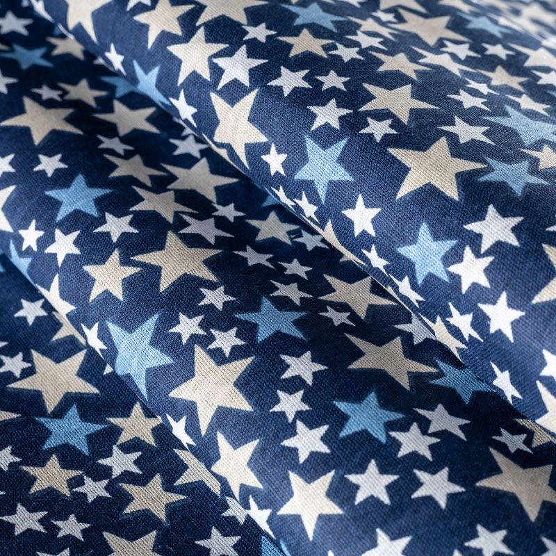 Плотная натуральная ткань с особым принципом переплетения нитей: крест-накрест. Имеет гладкую матовую поверхность чуть шероховатую на ощупь, не тянется, немного просвечивает. Прочная и стойкая к износу, надолго сохраняет яркость красок, не растягивается при стирке, практически не мнется. Принт в виде цветных звездочек разного размера на темно-синем фоне прекрасно подойдет для пошива постельного белья, изготовления пеленок, бортиков для кроватки, домашней одежды и других предметов интерьера.