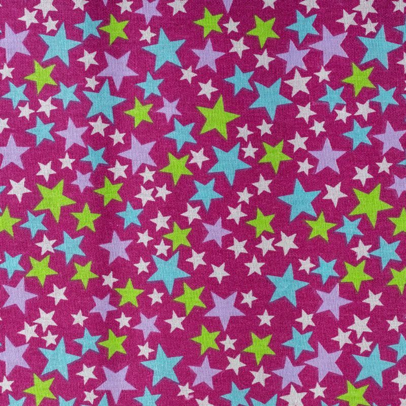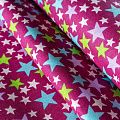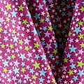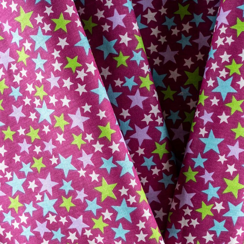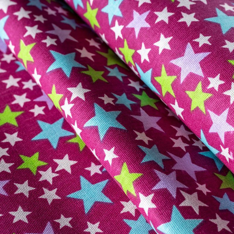 Плотная натуральная ткань с особым принципом переплетения нитей: крест-накрест. Имеет гладкую матовую поверхность чуть шероховатую на ощупь, не тянется, немного просвечивает. Прочная и стойкая к износу, надолго сохраняет яркость красок, не растягивается при стирке, практически не мнется. Принт в виде цветных звездочек разного размера на темно-малиновом фоне прекрасно подойдет для пошива постельного белья, изготовления пеленок, бортиков для кроватки, домашней одежды и других предметов интерьера.