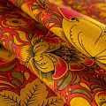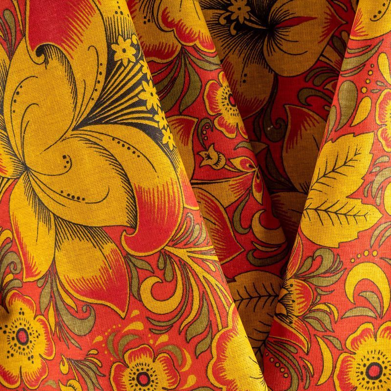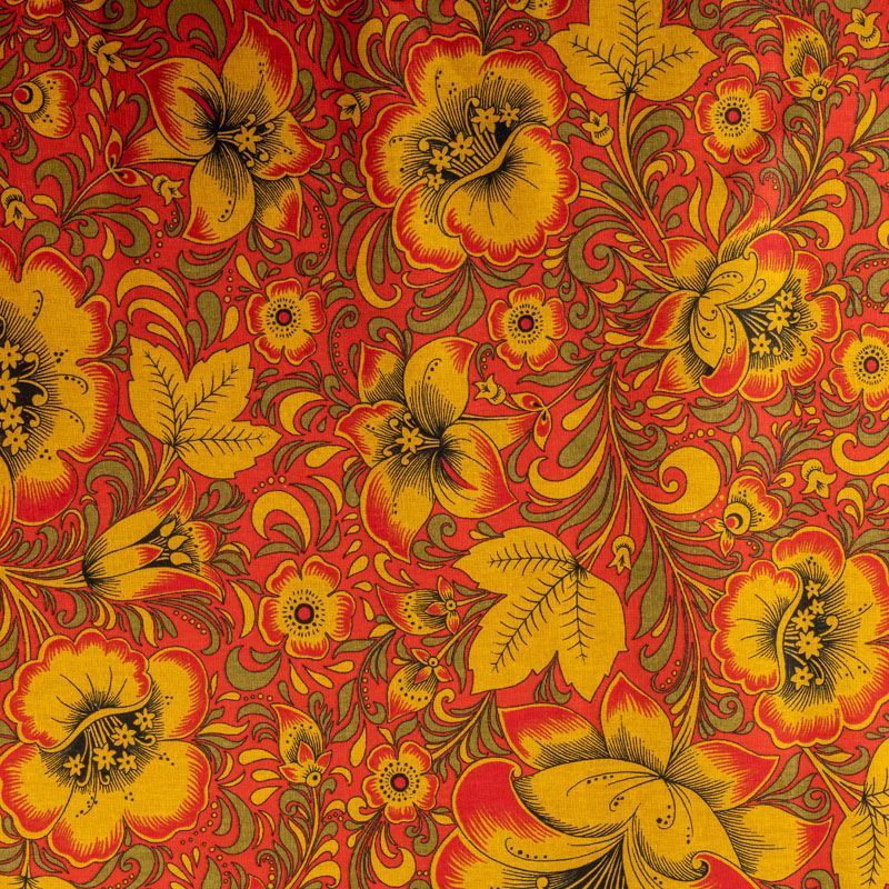 Плотная натуральная ткань с особым принципом переплетения нитей: крест-накрест. Имеет гладкую матовую поверхность, немного шероховатая на ощупь, не тянется, немного просвечивает. Прочная и стойкая к износу, надолго сохраняет яркость красок, практически не мнется. Яркий узнаваемый принт по мотивам народного творчества на красном фоне прекрасно подойдет для пошива постельного и столового белья, изготовления сценических костюмов, домашней одежды и других предметов интерьера.