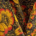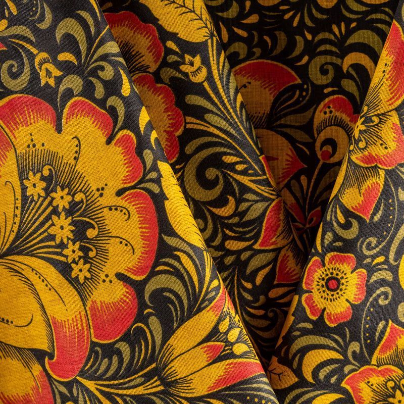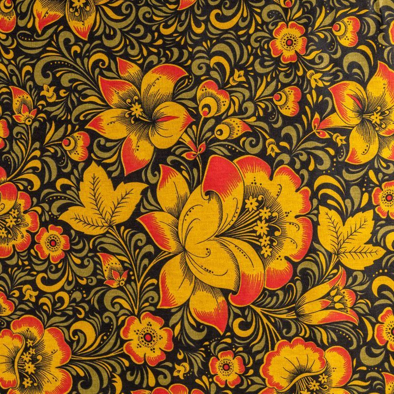 Плотная натуральная ткань с особым принципом переплетения нитей: крест-накрест. Имеет гладкую матовую поверхность, немного шероховатая на ощупь, не тянется, немного просвечивает. Прочная и стойкая к износу, надолго сохраняет яркость красок, практически не мнется. Яркий узнаваемый принт по мотивам народного творчества на черном фоне прекрасно подойдет для пошива постельного и столового белья, изготовления сценических костюмов, домашней одежды и других предметов интерьера.