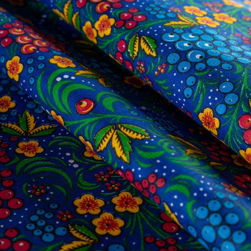 Плотная натуральная ткань с особым принципом переплетения нитей: крест-накрест. Имеет гладкую матовую поверхность, немного шероховатая на ощупь, не тянется, немного просвечивает. Прочная и стойкая к износу, надолго сохраняет яркость красок, практически не мнется. Мелкий цветной растительный принт на васильковом фоне прекрасно подойдет для пошива постельного и столового белья, изготовления сценических костюмов, домашней одежды и других предметов интерьера.