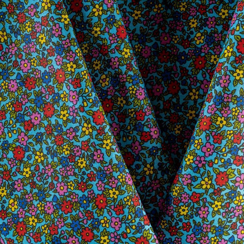 Плотная натуральная ткань с особым принципом переплетения нитей: крест-накрест. Имеет гладкую матовую поверхность, немного шероховатая на ощупь, не тянется, немного просвечивает. Прочная и стойкая к износу, надолго сохраняет яркость красок, практически не мнется. Мелкий цветочный принт на голубом фоне прекрасно подойдет для пошива домашней одежды, халатов, фартуков, сарафанов, постельного белья и других предметов интерьера.