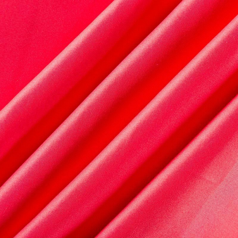 Плотное трикотажное полотно красного оттенка с малиновым подтоном. Обе стороны ткани ровные, гладкие. Материал эластичный, имеет растяжимость по всем сторонам, хорошо держит форму, уютный, приятный к телу и удобный в носке. Применяется в пошиве платьев, юбок, костюмов, жакетов.