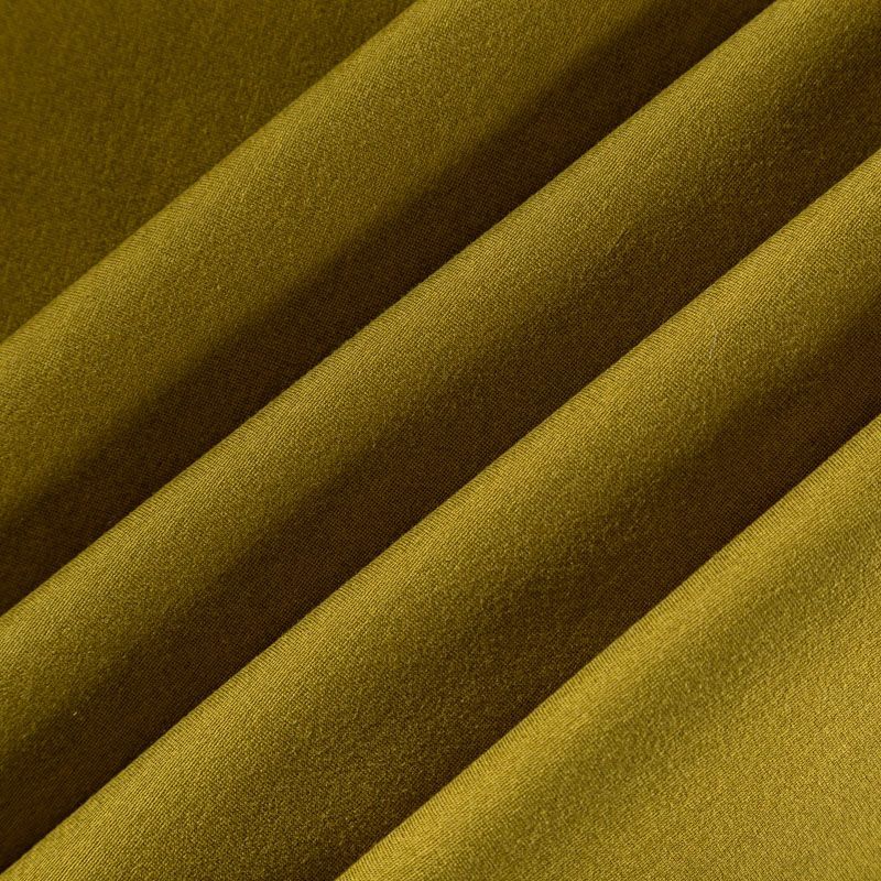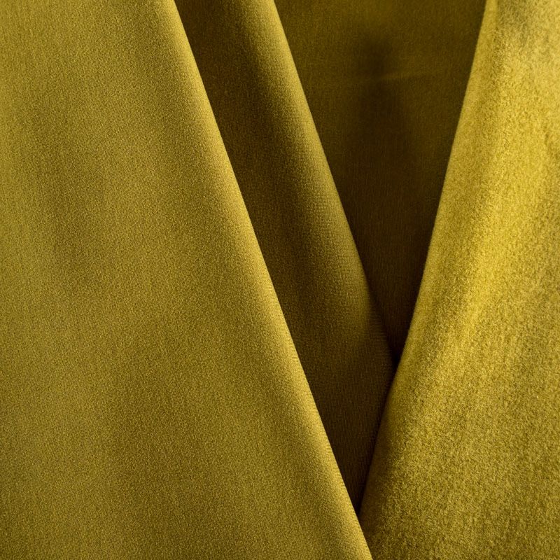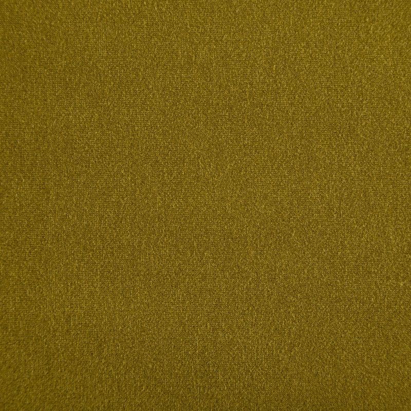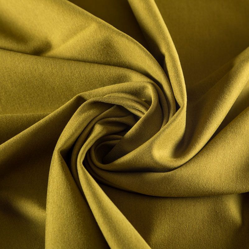 Эластичный, плотный хлопковый трикотаж темного оттенка горчицы. Поверхность ткани гладкая и матовая, с изнанки - с шелковистым мягким ворсом.  Материал упругий, имеет растяжимость по всем сторонам, не просвечивается, хорошо держит форму, уютный, приятный к телу и удобный в носке. Применяется в пошиве костюмов, жакетов, кардиганов, платьев и юбок.