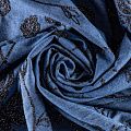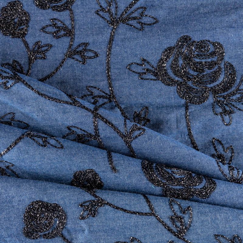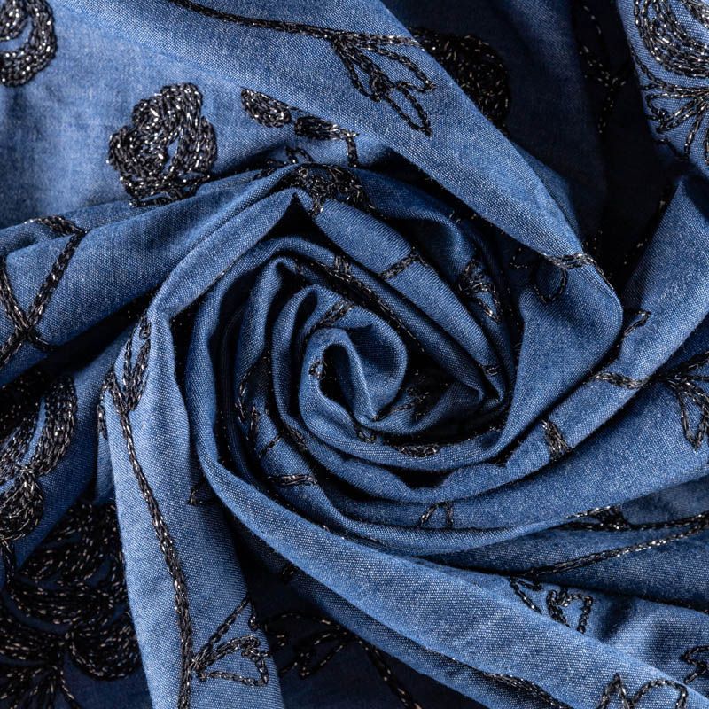 На сине-голубом фоне цветы, вышитые черной металлизированной нитью. Полотно легкое, средней плотности, очень пластичное, не держит форму.  Материал отлично драпируется, формируя мягкие складки. Подойдет для прямых, расклешенных платьев, сарафанов, платья-рубашки, юбки или туники.