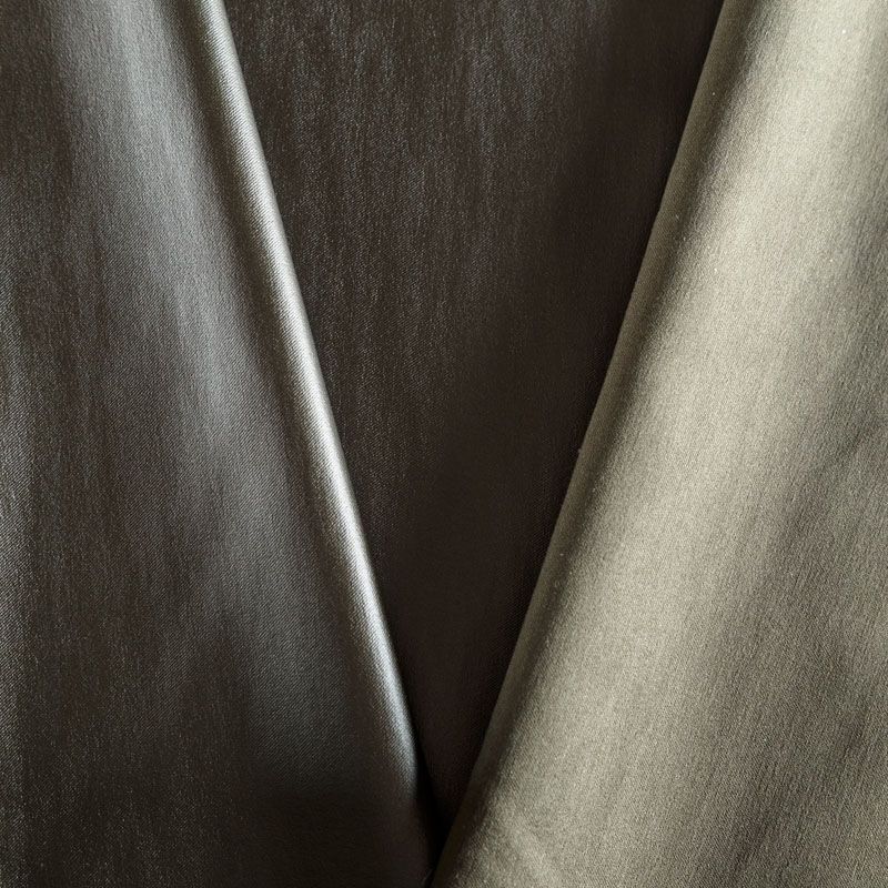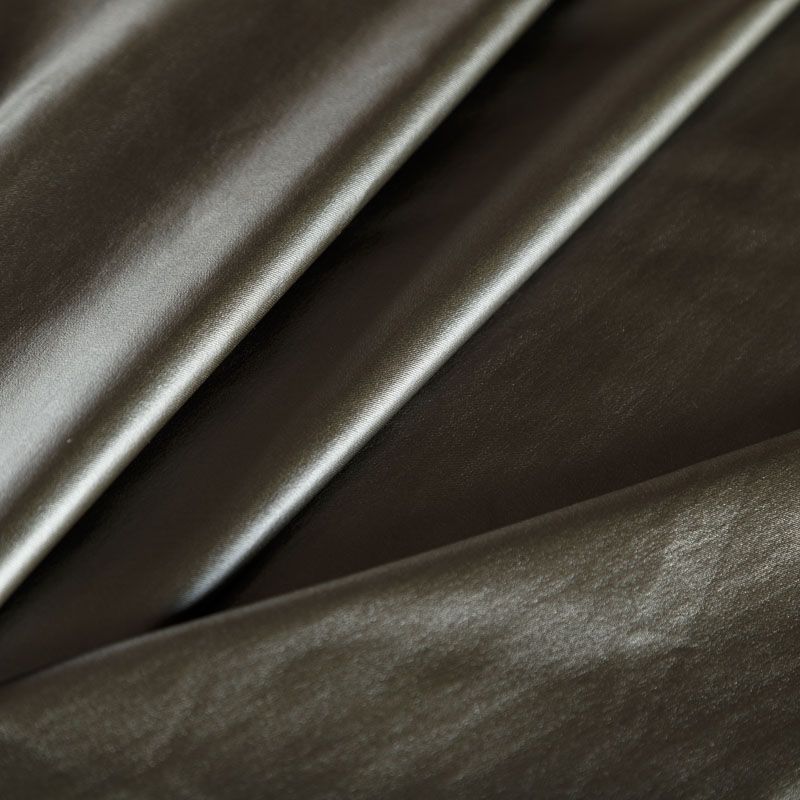 На лицевой поверхности ткани нанесен полиуретановый слой, имитирующий кожу, изнанка - матовая, фактурная в диагональный рубчик. Материал имеет высокую плотность, при небольшой толщине, приятный на ощупь, обладает устойчивостью к истиранию и механическим повреждениям. Подойдет для пошива рубашек, сарафанов, платьев, юбок, шорт, брюк-джоггеров, лёгких курток и жакетов, а также одежды облегающих фасонов.