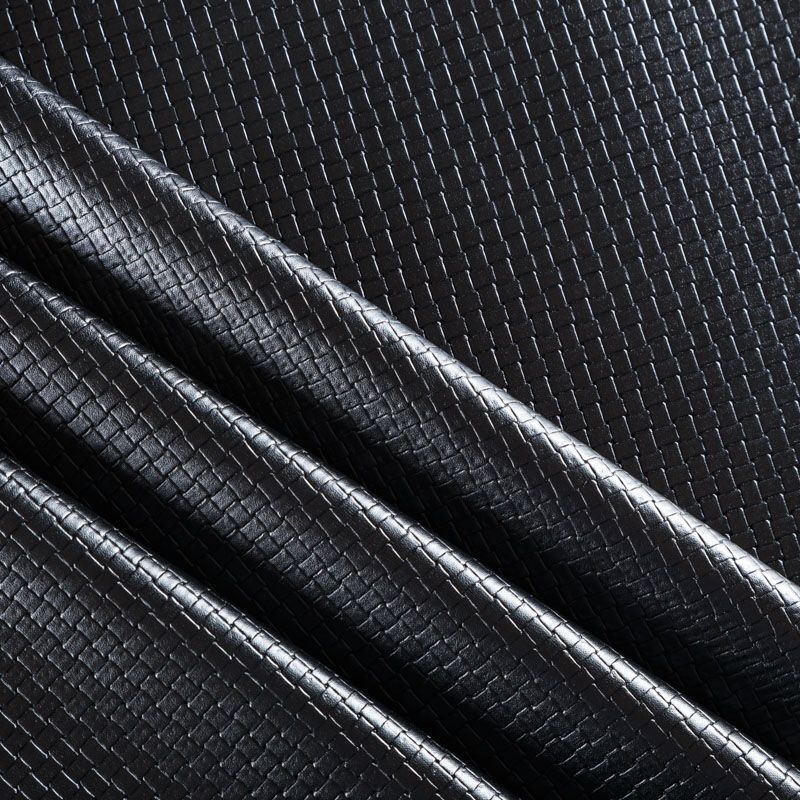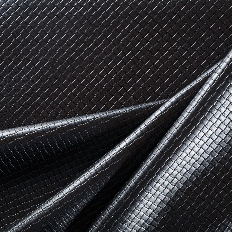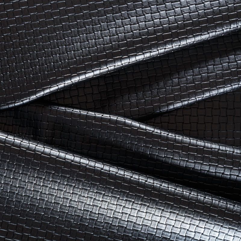 Итальянская экокожа в черном оттенке с объемной фактурой в виде плетения. Очень приятная на ощупь, отлично тянется, пластичная. С изнаночной стороны трикотаж черного цвета. Подойдет для пошива платья, брюк, шорт, юбки, куртки, плаща, пальто-рубашки.