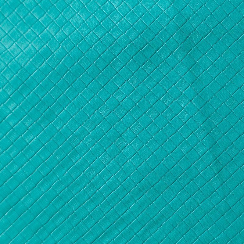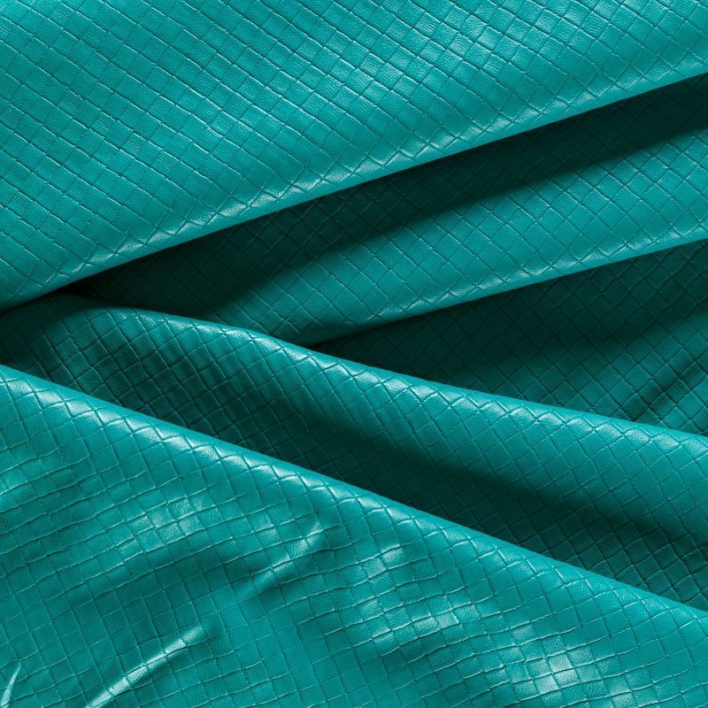 Экокожа в зеленом оттенке с объемной фактурой, имитирующей плетенку. Очень приятная на ощупь, пластичная. Подойдет для пошива платья, брюк, шорт, юбки, куртки, плаща, пальто-рубашки, а также сумки, рюкзака и других аксессуаров.