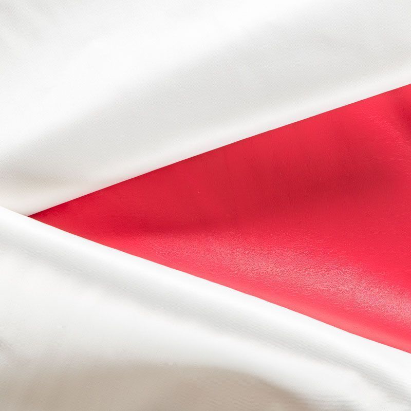Искусственный материал, имитирующий натуральную кожу, на тканной основе. Изнаночная сторона - молочного оттенка. Экокожа тоньше натуральной, не мнется, пластична, тянется, хорошо облегает фигуру. Подойдет для пошива куртки, костюма, платья, юбки, брюк, шорт, комбинезона, сумки, рюкзака.