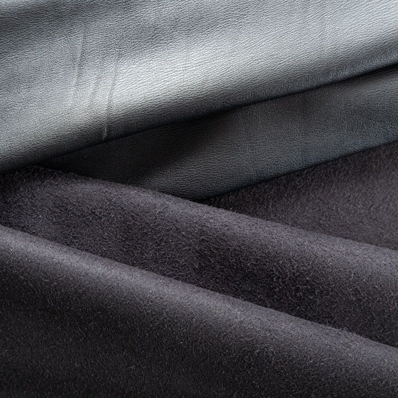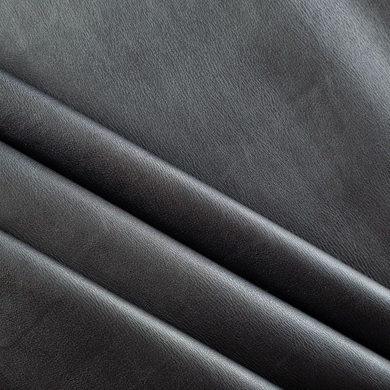 Искусственный материал, имитирующий натуральную кожу черного цвета. Поверхность матовая, гладкая. Изнаночная сторона с имитацией черной замши. Приятная на ощупь, тянется, не просвечивает, пластичная. Подойдет для пошива куртки, костюма, платья, юбки, брюк, шорт, комбинезона, сумки, рюкзака.