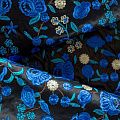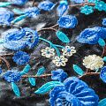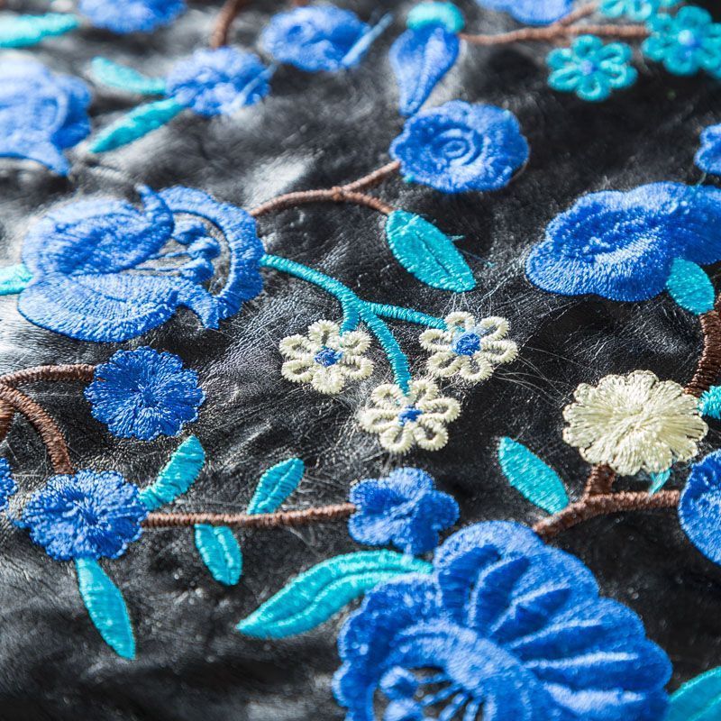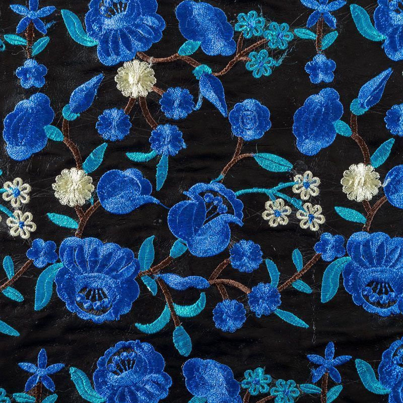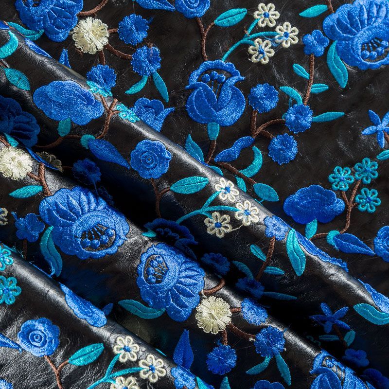 Искусственный материал, имитирующий натуральную кожу черного цвета с богатой объемной цветочной вышивкой в синих оттенках. Поверхность ткани полуматовая, гладкая. Приятная на ощупь, держит форму, не просвечивает, пластичная. Подойдет для пошива куртки, костюма, платья, юбки, брюк, шорт, комбинезона, сумки, рюкзака.