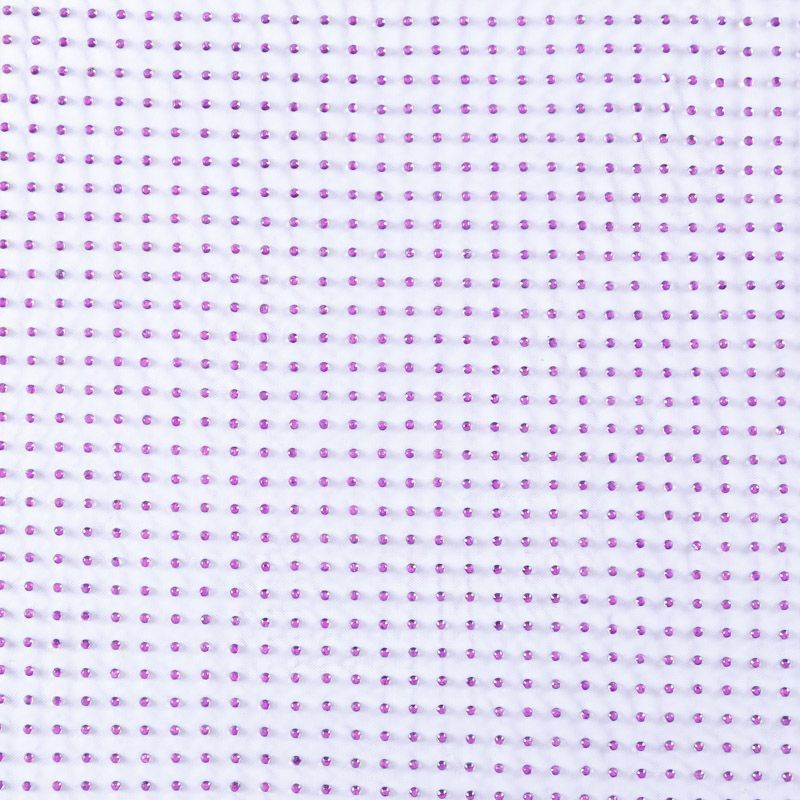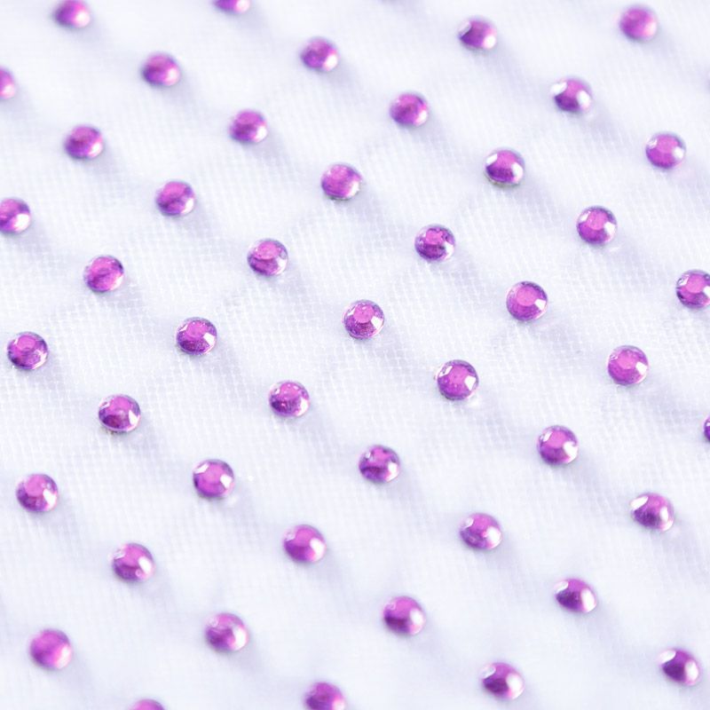 Тонкая прозрачная сетка средней жесткости сиреневого оттенка декорирована клеевыми стразами в тон полотна. Используется для пошива одежды для различных праздников, концертов, пышных юбок, платьев, а также для отделки и украшения, создания предметов декора и украшения помещений для торжественных мероприятий.