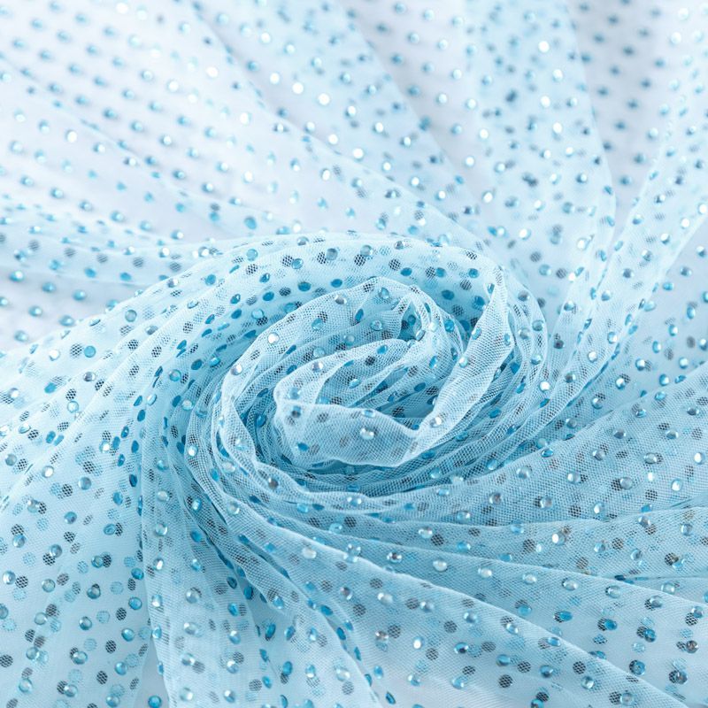 Тонкая прозрачная сетка средней жесткости голубого оттенка декорирована клеевыми стразами в тон полотна. Используется для пошива одежды для различных праздников, концертов, пышных юбок, платьев, а также для отделки и украшения, создания предметов декора и украшения помещений для торжественных мероприятий.