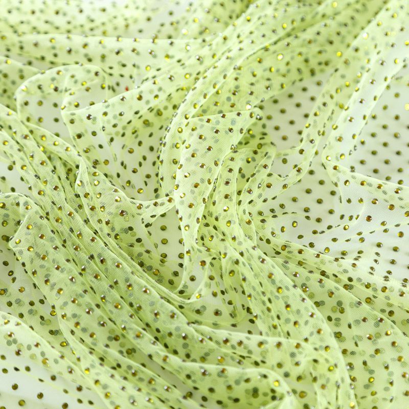 Тонкая прозрачная сетка средней жесткости зеленого оттенка декорирована клеевыми стразами в тон полотна. Используется для пошива одежды для различных праздников, концертов, пышных юбок, платьев, а также для отделки и украшения, создания предметов декора и украшения помещений для торжественных мероприятий.