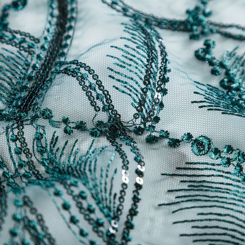 Кружевное полотно на сетчатой основе темно-зеленого оттенка с абстрактным узором, расположенным по ширине ткани. Тонкое, легкое, очень мягкое и пластичное, хорошо драпируется, приятное тактильно. Вышивка дополнена глянцевыми пайетками в тон. С обеих сторон ткань украшена симметричными фестонами, что придает полотну законченный и нарядный вид. Великолепно будет смотреться в нарядном вечернем, свадебном платье, платье на выпускной бал, в юбках, блузках, топах. На изделие набирается объемом.