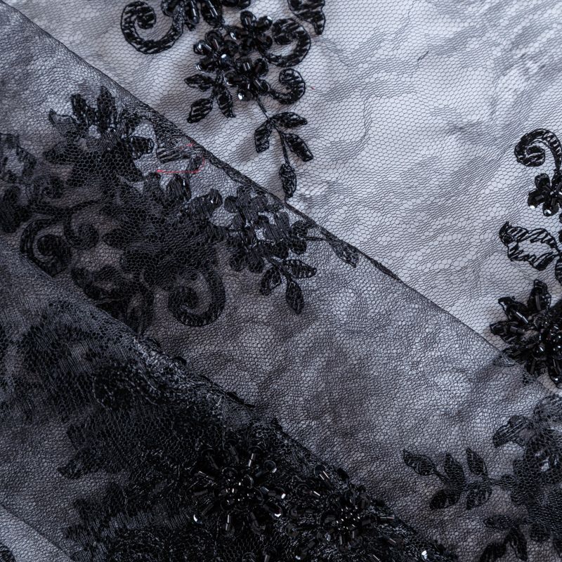 Вышивка на сетке черного оттенка с флористическим узором. Полотно мягкое, легкое и пластичное, хорошо тянется. Сетка не жесткая, приятная к телу. Узор вышит мягкой пряжей, образуя красивую фактуру, имитирующую ручную вышивку, и оформлен бисером и стеклярусом. С обеих сторон ткань украшена симметричными фестонами, что придает полотну законченный и нарядный вид. Великолепно будет смотреться в нарядном вечернем платье, платье на выпускной бал, в блузках, топах. Набирается для изделия объемом.