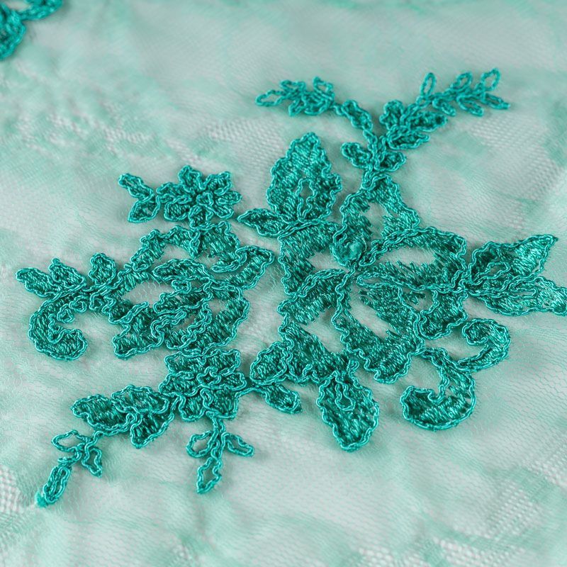 Кружевное полотно на сетчатой жаккардовой основе насыщенного оттенка бриллиантовой зелени с флористическим узором. Тонкое, легкое, очень мягкое и пластичное, хорошо драпируется, приятное тактильно. Вышивка оформлена кордовой нитью. С обеих сторон ткань украшена симметричными фестонами, что придает полотну законченный и нарядный вид. Великолепно будет смотреться в нарядном вечернем, свадебном платье, платье на выпускной бал, в юбках, блузках, топах. Также можно применять отдельные элементы для декора, которые вырезаются из полотна.