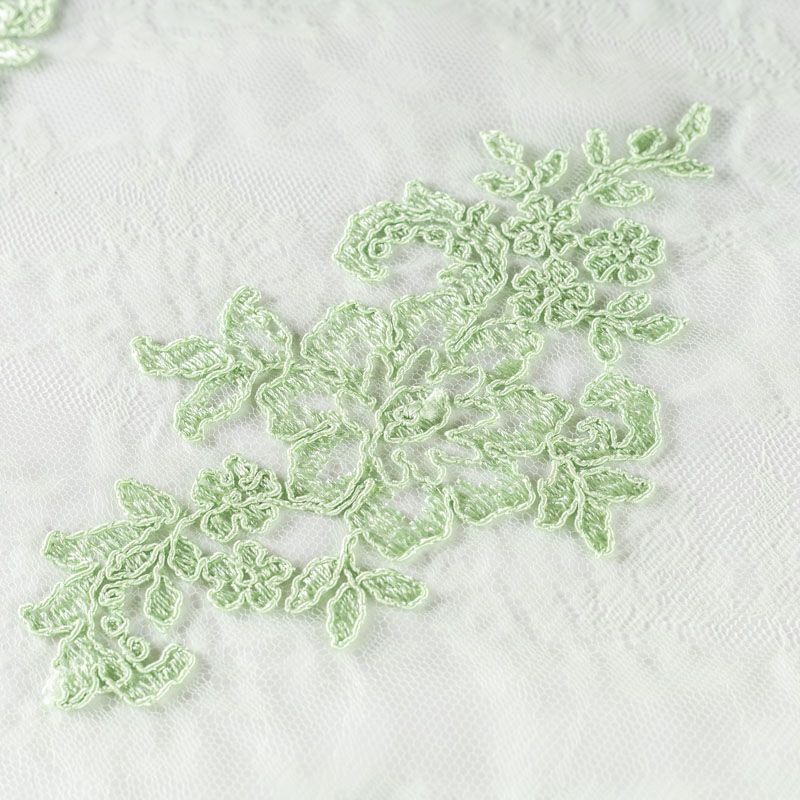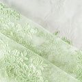 Кружевное полотно на сетчатой жаккардовой основе весеннего светло-зеленого оттенка с флористическим узором. Тонкое, легкое, очень мягкое и пластичное, хорошо драпируется, приятное тактильно. Вышивка оформлена кордовой нитью. С обеих сторон ткань украшена симметричными фестонами, что придает полотну законченный и нарядный вид. Великолепно будет смотреться в нарядном вечернем, свадебном платье, платье на выпускной бал, в юбках, блузках, топах. Также можно применять отдельные элементы для декора, которые вырезаются из полотна.