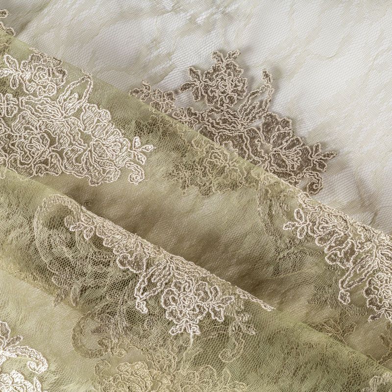 Кружевное полотно на сетчатой жаккардовой основе цвета фисташки с флористическим узором. Тонкое, легкое, очень мягкое и пластичное, хорошо драпируется, приятное тактильно. Вышивка оформлена кордовой нитью. С обеих сторон ткань украшена симметричными фестонами, что придает полотну законченный и нарядный вид. Великолепно будет смотреться в нарядном вечернем, свадебном платье, платье на выпускной бал, в юбках, блузках, топах. Также можно применять отдельные элементы для декора, которые вырезаются из полотна.