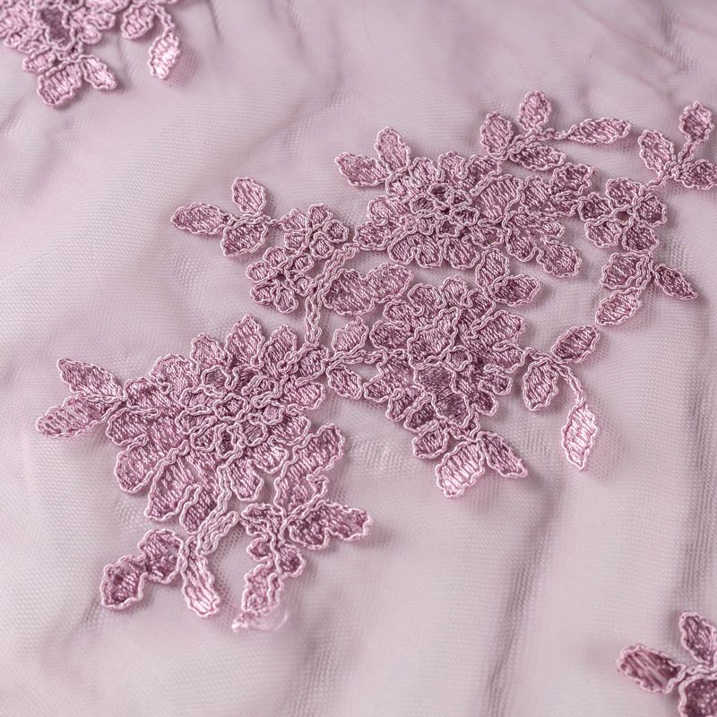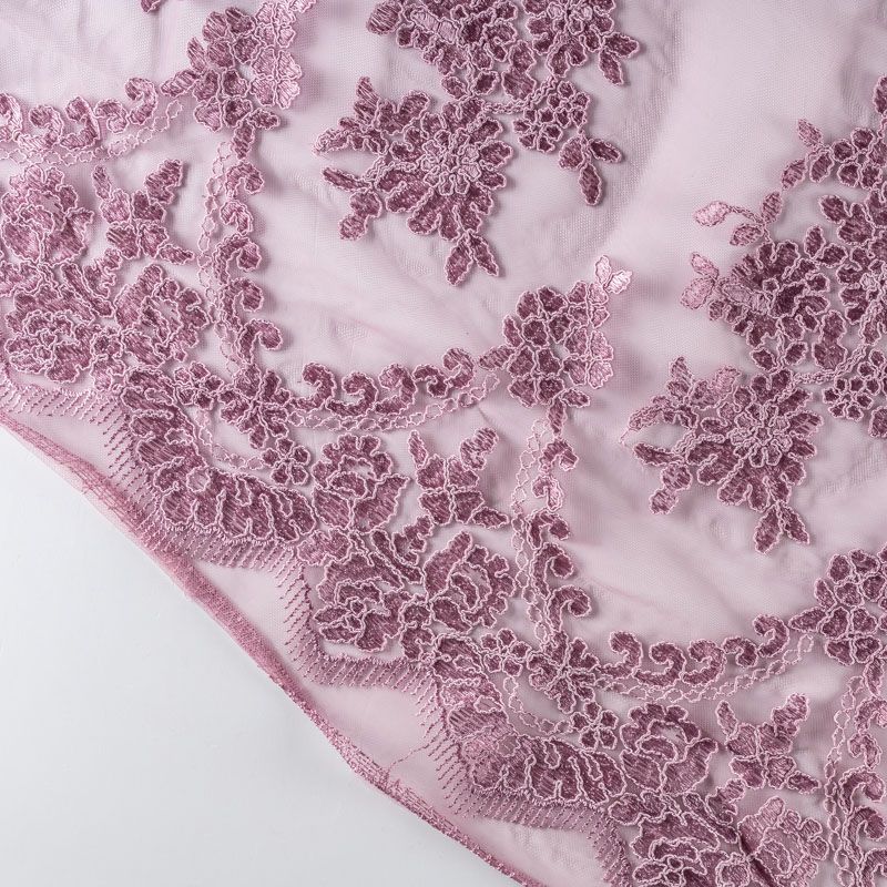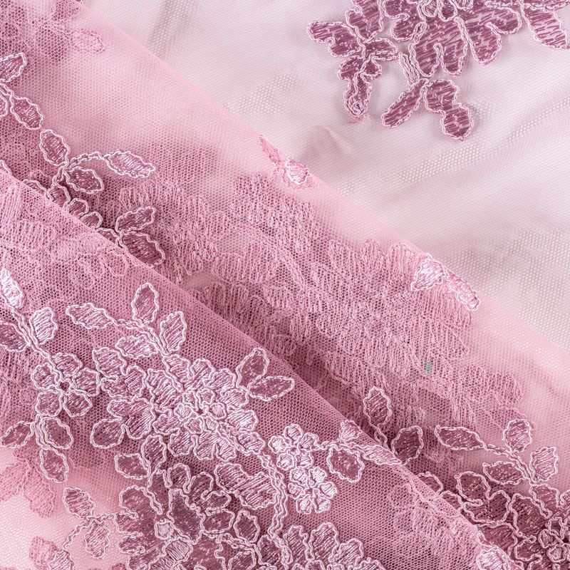 Вышивка на сетке розового оттенка с флористическим узором. Полотно мягкое, легкое и пластичное, хорошо тянется. Сетка не жесткая, приятная к телу. Узор вышит мягкой пряжей, образуя красивую фактуру, имитирующую ручную вышивку, и оформлен кордовой нитью. С обеих сторон ткань украшена симметричными фестонами, что придает полотну законченный и нарядный вид. Великолепно будет смотреться в нарядном вечернем платье, платье на выпускной бал, в блузках, топах. Набирается для изделя объемом.