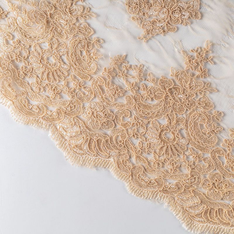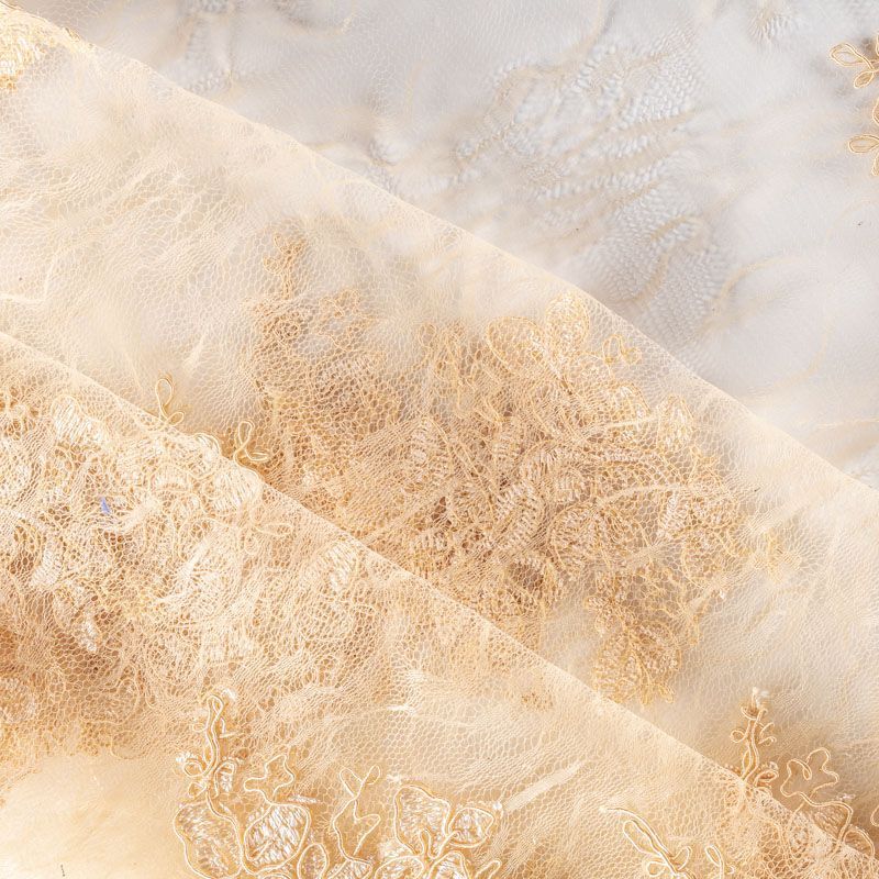 Кружевное полотно на сетчатой жаккардовой основе золотистого оттенка с флористическим узором. Тонкое, легкое, очень мягкое и пластичное, хорошо драпируется, приятное тактильно. Вышивка оформлена кордовой нитью. С обеих сторон ткань украшена симметричными фестонами, что придает полотну законченный и нарядный вид. Великолепно будет смотреться в нарядном вечернем, свадебном платье, платье на выпускной бал, в юбках, блузках, топах. Также можно применять отдельные элементы для декора, которые вырезаются из полотна.
