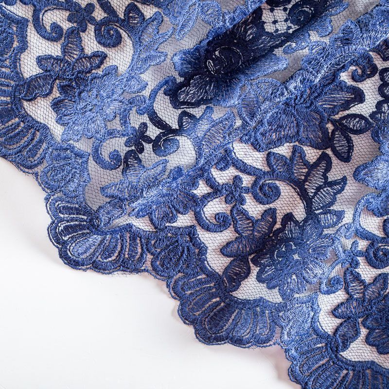 Кружевное полотно без тканной основы с цветочным ажурным плетением по всей ширине и фестонами по обе стороны кромок. Материал прозрачный на теле и на просвет, в вышивку красиво вплетена кордовая нить, которая придает текстуру, с матовым благородным блеском. Великолепно будет смотреться в нарядном вечернем, свадебном платье, платье на выпускной бал, в юбках, блузках, топах. Также можно применять отдельные элементы для декора, которые вырезаются из полотна. Набирается на изделие объемом.