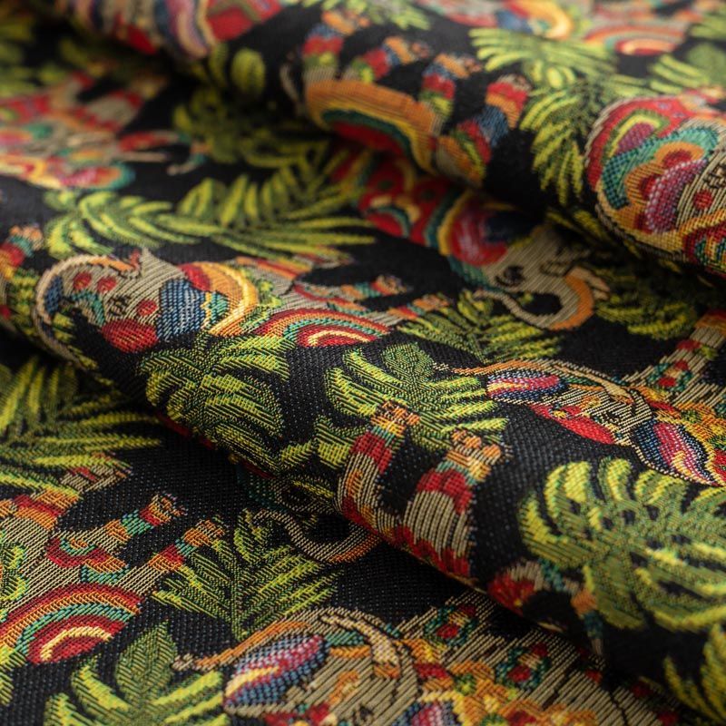 Гобелен представляет собой ткань, выполненную  перекрестным плетением нитей с одномоментным созданием сюжетной или орнаментальной композиции. Это плотный материал высокую прочность и износостойкость. Гобелен используют для пошива плотных светонепроницаемых штор, декоративного домашнего текстиля и аксессуаров, в мебельном производстве для обивки мебели. Так же применяется в рукоделии: модные кошельки, сумочки, пояса и другие аксессуары и при изготовлении дизайнерской одежды. На черном фоне цветное разнообразие тропических растений и "нарядных" слоников.