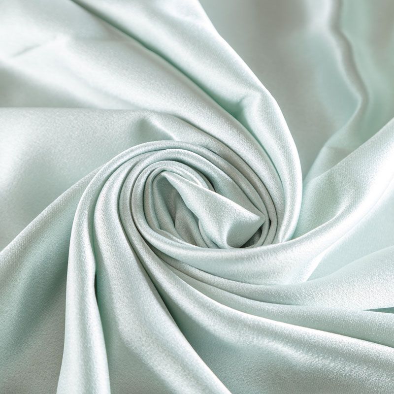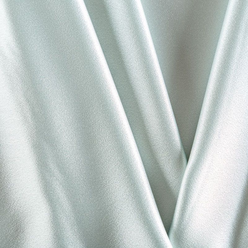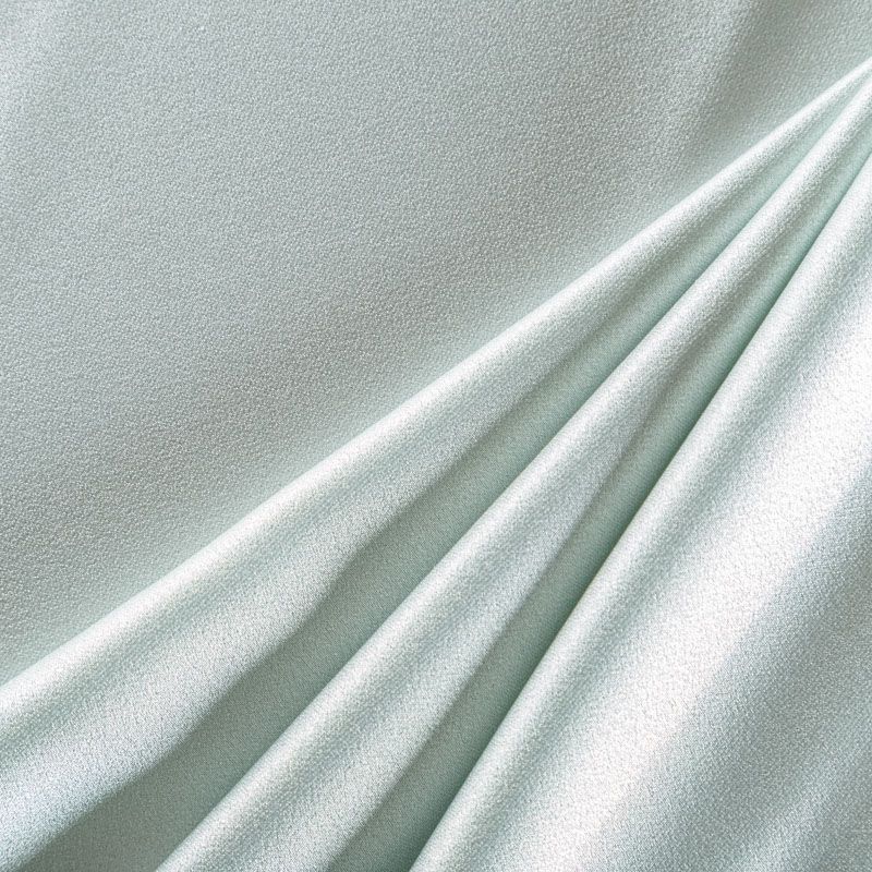 Итальянская ткань кади мятного оттенка. Кади — это креп-атлас с красивым глянцевым блеском. Ткань с плотной фактурой, роскошно ниспадает, очень хорошо тянется, изумительно садится по фигуре и шикарно смотрится в изделии. Она хорошо драпируется, эффектно облегает. Подходит для пошива удлиненных платьев с драпировками, платья-футляра, брюк палаццо, юбки-карандаш, жакета, туники, кроп-топа, а также для вечерних, свадебных и  выпускных платьев и костюмов.