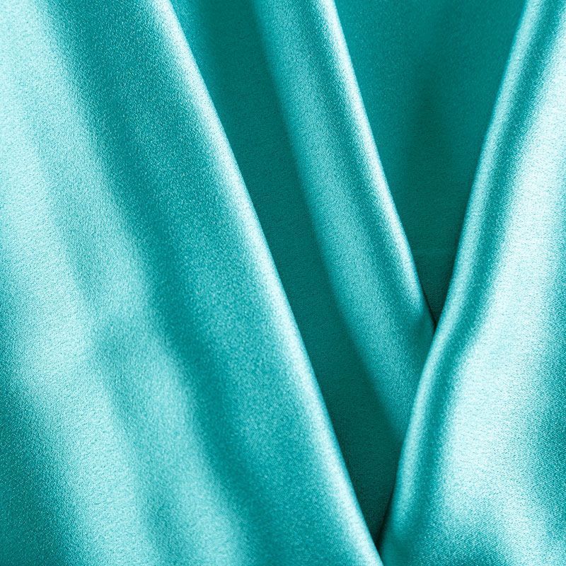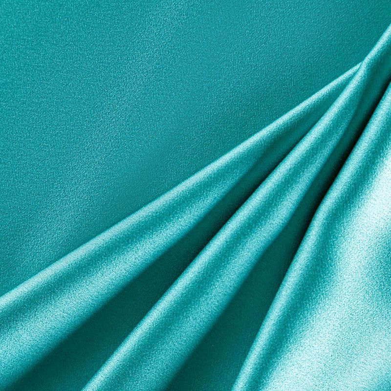 Итальянская ткань кади зеленого оттенка. Кади — это креп-атлас с красивым глянцевым блеском. Ткань с плотной фактурой, роскошно ниспадает, очень хорошо тянется, изумительно садится по фигуре и шикарно смотрится в изделии. Она хорошо драпируется, эффектно облегает. Подходит для пошива удлиненных платьев с драпировками, платья-футляра, брюк палаццо, юбки-карандаш, жакета, туники, кроп-топа, а также для вечерних, свадебных и  выпускных платьев и костюмов.