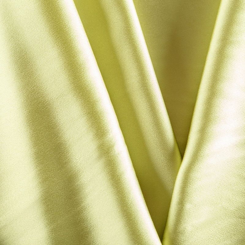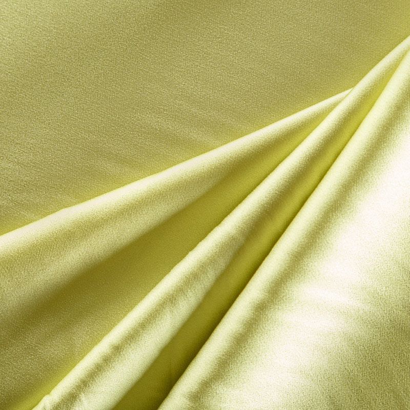 Итальянская ткань кади желто-зеленого оттенка. Кади — это креп-атлас с красивым глянцевым блеском. Ткань с плотной фактурой, роскошно ниспадает, очень хорошо тянется, изумительно садится по фигуре и шикарно смотрится в изделии. Она хорошо драпируется, эффектно облегает. Подходит для пошива удлиненных платьев с драпировками, платья-футляра, брюк палаццо, юбки-карандаш, жакета, туники, кроп-топа, а также для вечерних, свадебных и  выпускных платьев и костюмов.