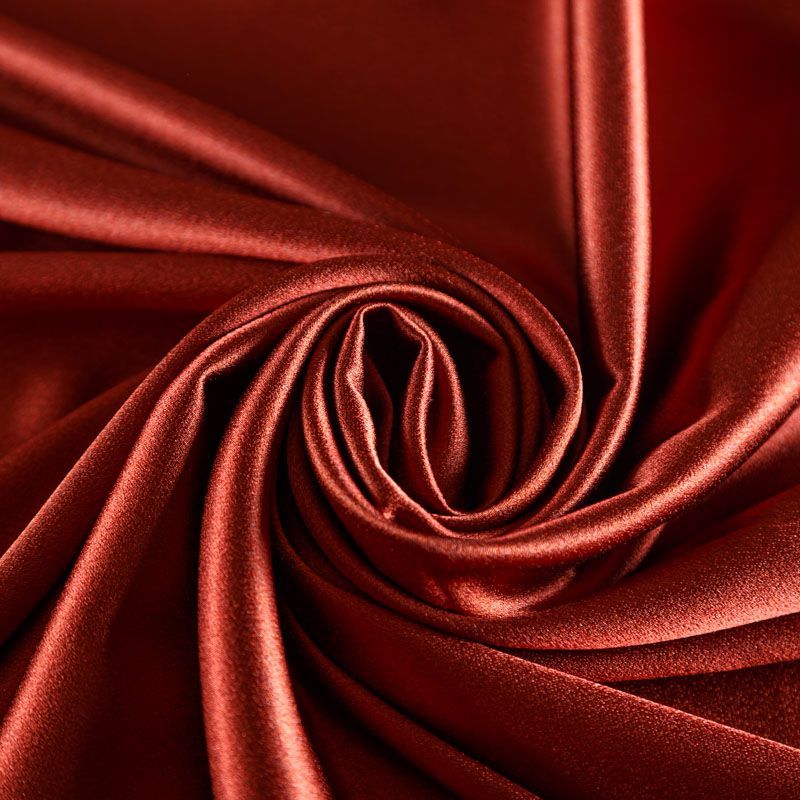 Итальянская ткань кади терракотового оттенка. Кади — это креп-атлас с красивым глянцевым блеском. Ткань с плотной фактурой, роскошно ниспадает, очень хорошо тянется, изумительно садится по фигуре и шикарно смотрится в изделии. Она хорошо драпируется, эффектно облегает. Подходит для пошива удлиненных платьев с драпировками, платья-футляра, брюк палаццо, юбки-карандаш, жакета, туники, кроп-топа, а также для вечерних, свадебных и  выпускных платьев и костюмов.