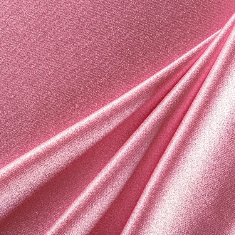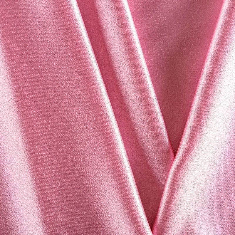 Итальянская ткань кади розового оттенка. Кади — это креп-атлас с красивым глянцевым блеском. Ткань с плотной фактурой, роскошно ниспадает, очень хорошо тянется, изумительно садится по фигуре и шикарно смотрится в изделии. Она хорошо драпируется, эффектно облегает. Подходит для пошива удлиненных платьев с драпировками, платья-футляра, брюк палаццо, юбки-карандаш, жакета, туники, кроп-топа, а также для вечерних, свадебных и  выпускных платьев и костюмов.